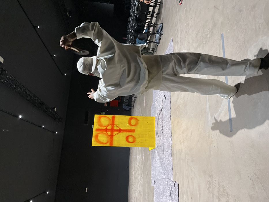 The image captures an indoor scene within a large, dark performance or exhibition space located in Barcelona, Spain. In the foreground, a single individual is viewed from the back, dressed entirely in a monochrome white ensemble consisting of a cap, a loose-fitting jacket, trousers, and sneakers. The person's right arm is raised high, holding a dark, curved object, possibly a throwing implement, while the left arm is also elevated, with the palm facing forward. Approximately centered in the midground is a bright yellow rectangular panel standing vertically on the concrete floor, supported by a base. This panel is adorned with abstract red spray-painted designs, including a central cross-like figure surrounded by multiple circles. Gray, mottled protective sheets are spread across the concrete floor immediately in front of and around the base of the yellow panel. In the background, to the right, multiple rows of dark, unoccupied or sparsely occupied chairs are visible, arranged as audience seating. The venue's walls and ceiling are black, with several recessed spotlights providing illumination. A red emergency exit sign and a partial view of a red fire extinguisher cabinet are discernible on the rear black wall behind the yellow panel. A faint horizontal line is marked on the concrete floor behind the person in white.