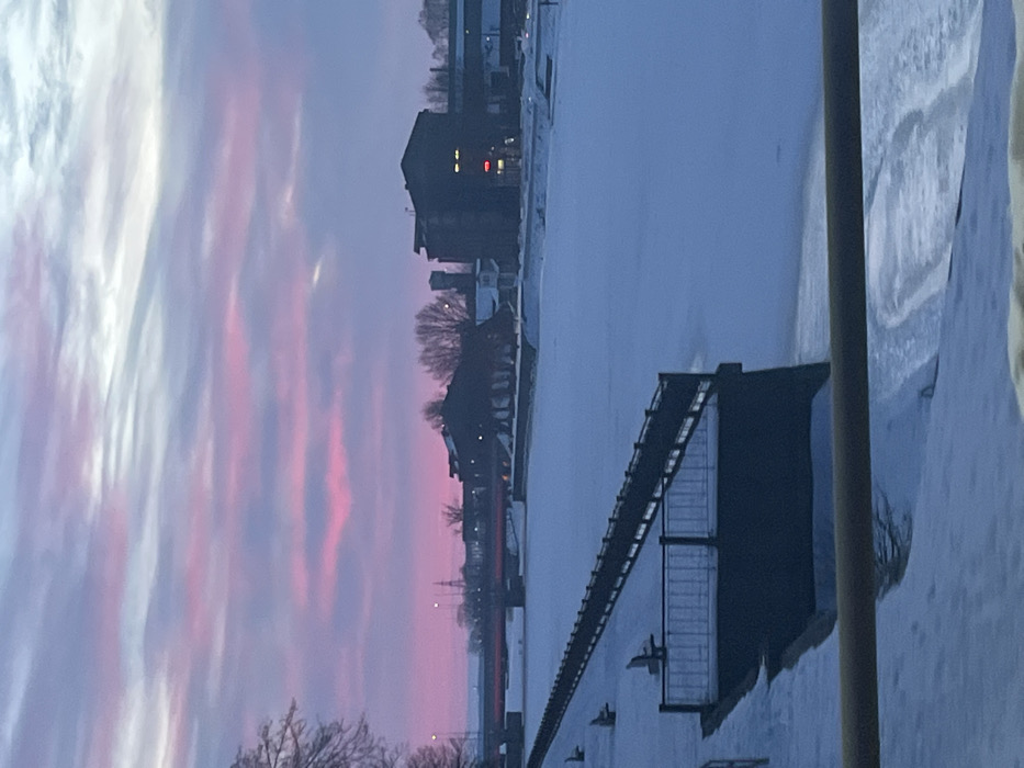 The image depicts a winter scene during either dawn or dusk in Liepaja, Latvia. The sky is characterized by bands of vibrant pink and purple clouds at lower altitudes, transitioning to lighter shades of blue and gray towards the zenith. A wide water body, likely a canal or river, spans the midground, largely covered in white snow and ice, with darker patches of open water or thin ice visible closer to the edges. In the foreground on the left, a snow-dusted paved embankment or walkway runs parallel to the water. A long, dark-colored metal railing with regularly spaced vertical posts extends into the distance along this embankment. Several dark park benches, partially covered in snow, are situated along this railing. A rectangular dock or platform, also featuring dark railings, projects from the embankment into the frozen water. A dark, horizontal bar or railing occupies the immediate bottom edge of the frame, suggesting the vantage point of the photographer. Across the water, in the midground and background, a red bridge spans the width of the frozen channel. Beyond the bridge, a collection of dark-silhouetted industrial or commercial buildings with sloped roofs is visible, some displaying illuminated red and yellow signs or window lights. Bare deciduous trees are interspersed among these structures and along the far bank. A prominent, dark, multi-story structure and a tall, slender silhouette, possibly a spire or tower, rise above the other buildings in the distance. No human figures are present in the scene.