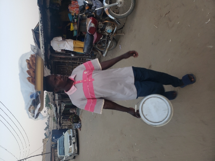 A man carries a bundle on his head with bread sticks visible at the top, and a white container in his hand