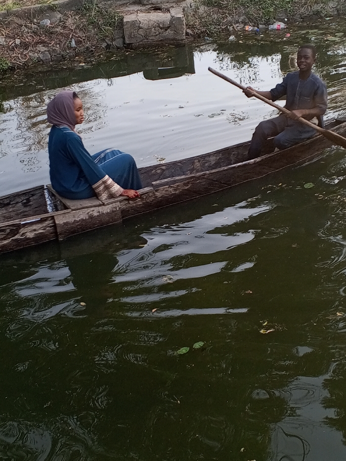 A young man rows a wooden boat on a green-tinted body of water. A woman wearing a headscarf sits in the back of the boat, facing the man. Both are wearing long-sleeved garments. The boat appears handmade, with the sides roughly hewn. Debris, including plastic bottles, floats on the water's surface near the bank. The background includes concrete structures and vegetation.