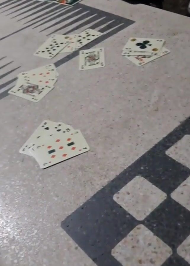 person sitting at a table playing cards. The table has a light-colored surface with a checkered pattern on one side. There are several cards scattered on the table, including some that are face up and some that are face down. The person is wearing a dark hoodie and appears to be using a cell phone. The lighting is somewhat dim, suggesting it may be evening or night. There are other objects on the table, including what appear to be small containers.
