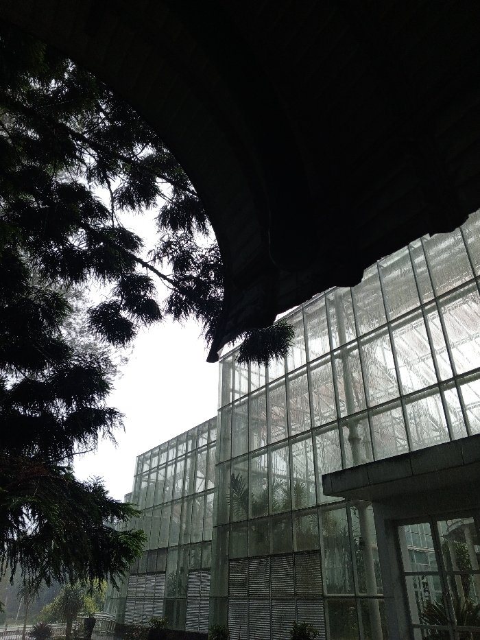 A low-angle shot captures a glass greenhouse structure against a muted sky. The building's facade is defined by rows of panes, with a glimpse of interior plants visible through the glass. Dark tree foliage in the foreground contrasts with the lighter greenhouse. An area in shadow suggests a sheltered space above, adding depth to the composition. The scene evokes a sense of enclosure and controlled natural environment.