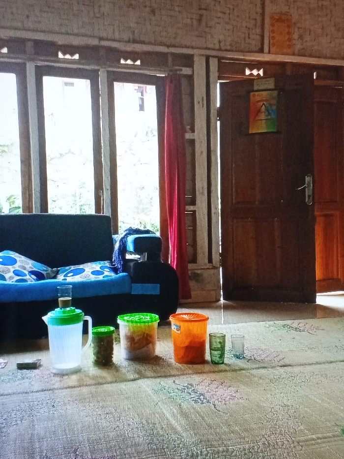 This image depicts the interior of a domestic residence in Taungpi, Myanmar (Burma). The view is oriented towards a windowed wall on the left and a partially open wooden door on the right, both allowing natural light into the room. The floor is covered with a light-colored, patterned woven mat. The walls appear to be constructed from a woven bamboo or similar natural material, with exposed wooden structural elements around the windows and door frames. Decorative, jagged cutouts are visible above the window frames and the door. In the foreground, a collection of items rests directly on the floor mat. From left to right: a small, dark rectangular object (possibly a phone or remote control); a translucent white plastic pitcher with a green lid, containing a clear liquid, with a small, clear glass balanced inverted on its lid; a small, clear plastic container with a green lid, filled with a dark, granular substance; a larger, clear plastic container with a green lid, holding light-colored, irregular items; an orange plastic container with an orange lid, containing orange-colored contents; a patterned green drinking glass; and a clear drinking glass. In the mid-ground, a dark-colored (likely black or dark blue) two-seater sofa is positioned facing the viewer. It features a light blue trim along its base and armrests. Two throw pillows with a repeating blue and white circular pattern are on the sofa cushions. A dark blue fabric or blanket is draped over the right armrest. The window assembly on the left consists of multiple tall, framed panes, through which bright diffused daylight is visible, suggesting an overcast sky or an indirect light source. A vertical red curtain hangs on the right side of the window frame. On the right side of the image, a dark wooden door is partially ajar, revealing a brightly lit space beyond. The door has a silver-colored handle. A small, rectangular piece of artwork or decoration, featuring a triangular shape with rainbow-colored sections against a light background, is affixed to the upper half of the door. No individuals are present in the scene, and no specific actions or interactions are depicted.