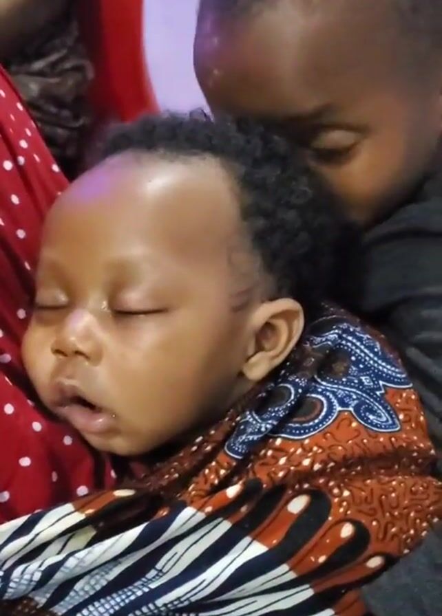 A baby is asleep in someone's arms, wrapped in a patterned cloth. The person holding the baby wears a red dress with white polka dots. Another child is looking at the baby. The background shows other people and parts of a room.