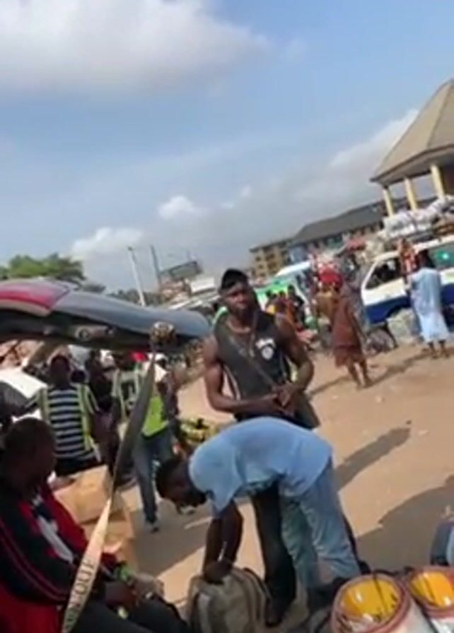 crowded outdoor marketplace. Several individuals are visible. One man is wearing a black tank top and appears to be standing guard or observing. Another man is wearing a blue shirt and is looking into a bag. People are walking around, some wearing yellow vests. Vehicles, including cars and vans loaded with items, are also present. The location seems to be a busy transportation hub, with goods being loaded and unloaded. The weather is sunny with a partly cloudy sky. The scene appears chaotic with many people and goods in transit.