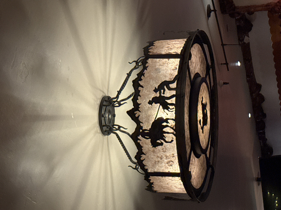 An ornate light fixture with a circular lampshade casts rays onto the wall. The lampshade depicts silhouettes of cowboys and cattle. It is attached to the wall with metal arms and a circular base. Parts of a room are visible on the right, including decorative molding and a dark space.