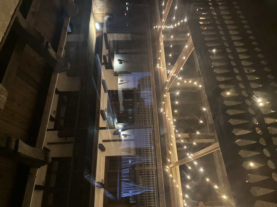The image depicts an indoor or semi-enclosed courtyard scene at night in Bansko, Bulgaria, observed through a reflective glass surface. The architectural style features traditional dark wooden beams and balconies. In the upper portion of the frame, an upper level of the building is visible. It consists of light-colored walls punctuated by dark wooden windows or doors, some with dark coverings or shutters. One window on the far left displays white, sheer curtains. A dark wooden balcony railing with decorative, repeated teardrop-shaped cutouts extends across this level. Several wall-mounted light fixtures, designed as upward-pointing sconces with a dark, pointed, possibly metal casing, illuminate the area beneath the wooden ceiling beams. Below this upper level, and partially obscured by reflections, is an open space. Strung across this area are multiple lines of warm-toned, small incandescent string lights, forming a grid-like pattern. These lights provide the primary illumination for the lower section of the scene. Below the string lights, dark wooden structural elements, likely beams, are visible. In the immediate foreground, a darker wooden railing, identical in design to the upper balcony railing, runs horizontally across the bottom third of the image. This railing is in sharper focus than much of the background, contributing to the reflections on the glass surface. No individuals are present in the scene. The overall lighting suggests an evening or nighttime setting.