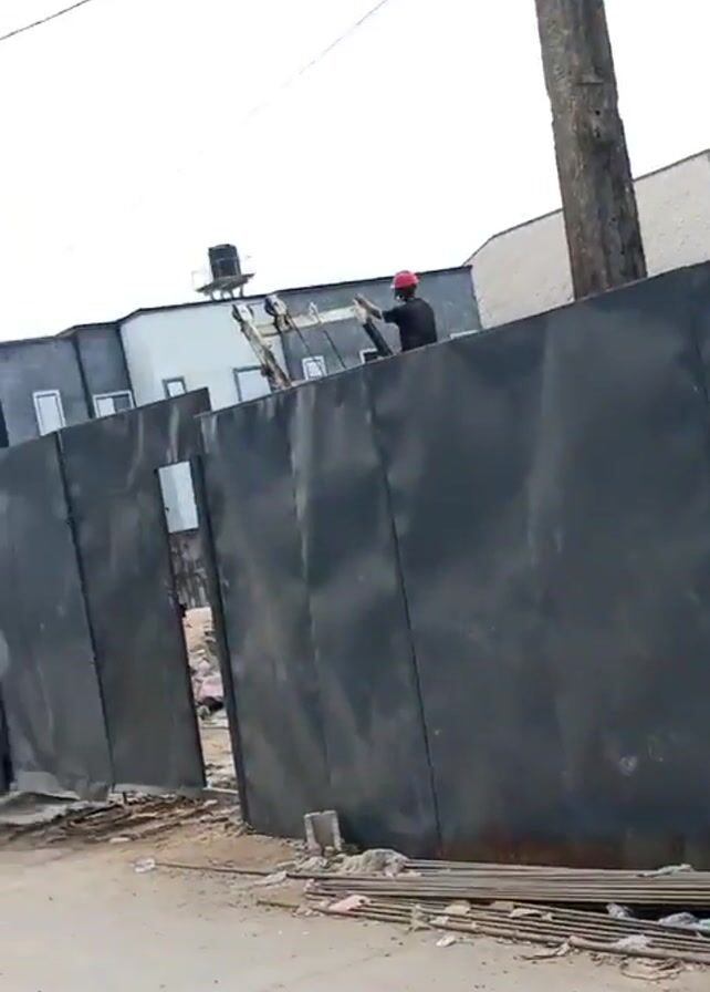 The camera faces a corrugated, metal gate with a rectangular opening in the center. A worker in a red helmet stands on top of the gate. Through the opening, a cement truck is partially visible. In the background, a grey building with white windows is visible. A utility pole stands tall to the right of the gate. The ground is a dirt road strewn with debris.