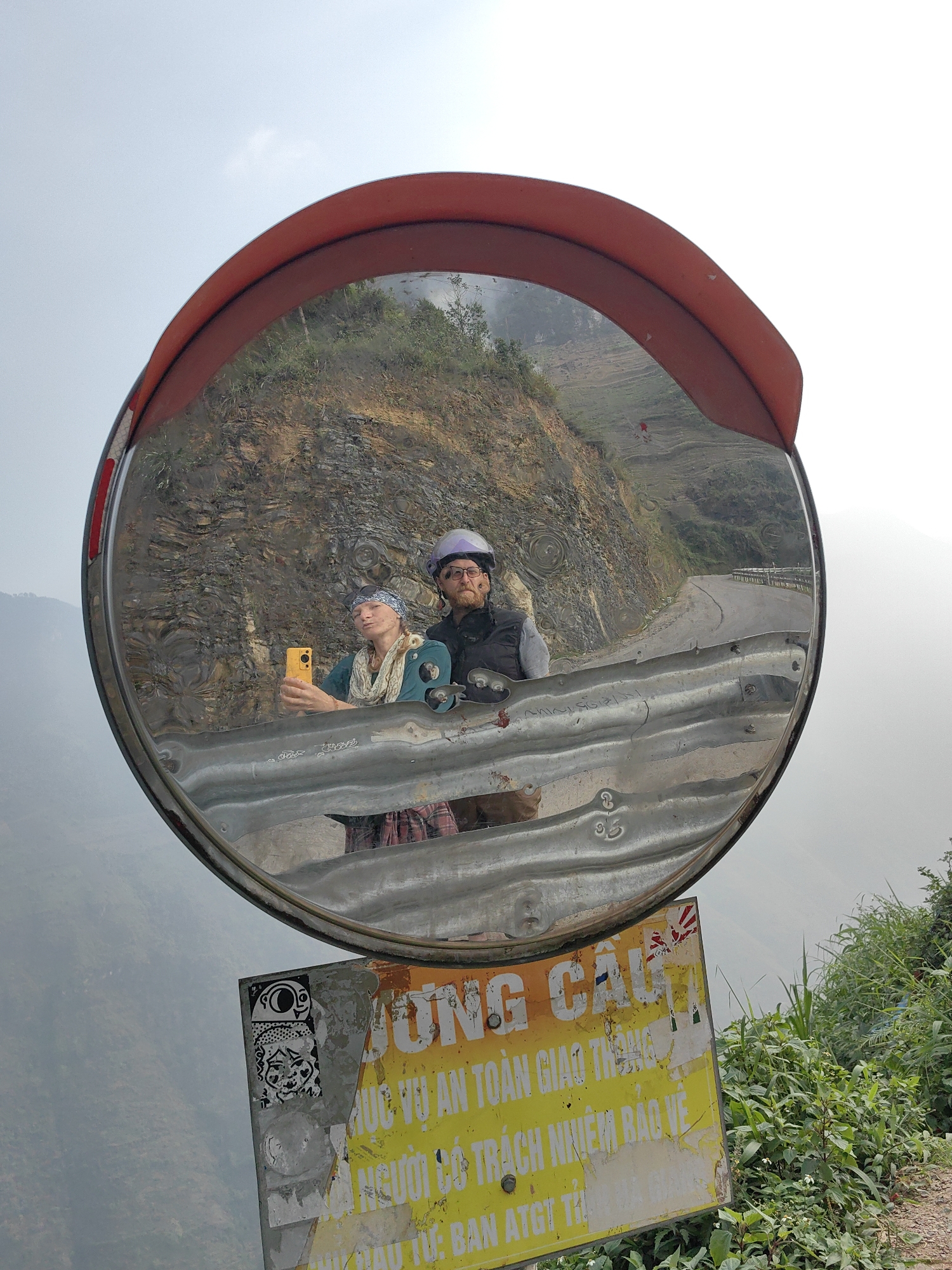 A convex safety mirror reflects two individuals on a mountainous road in Mèo Vạc Commune, Vietnam