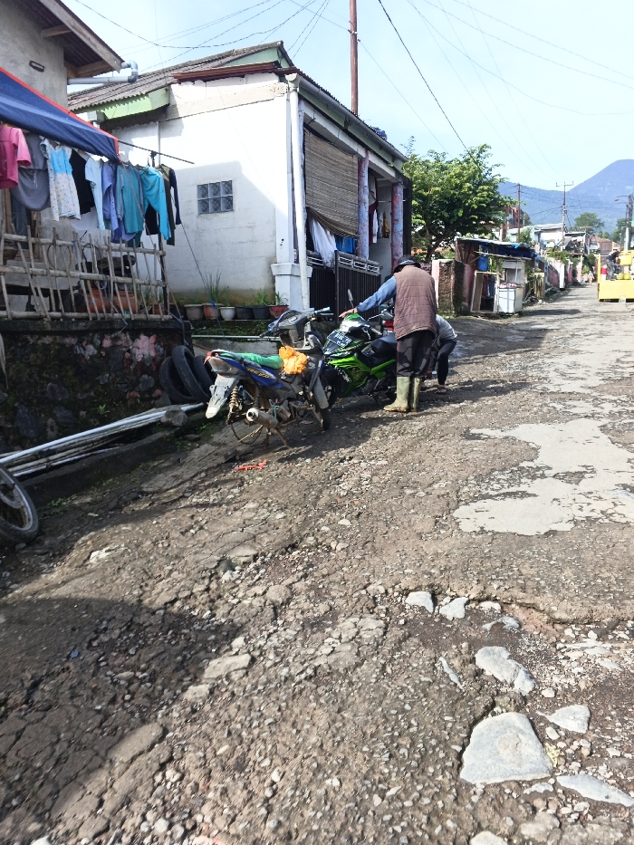 A rural scene shows a dilapidated road with a two motorcycles parked near a white building. Laundry hangs from a makeshift line. Two people are near the motorcycles. The road is broken and uneven. Other buildings are visible in the background, leading up to a mountain in the distance. The sky is partly cloudy.