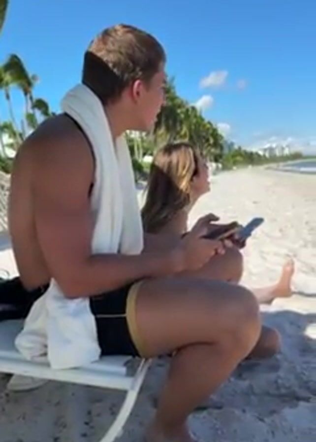 three people on a white sand beach. The sky is clear and blue. Palm trees are visible in the background. In the foreground, two people are seated on beach chairs and looking at their phones. A man with short blonde hair has a white towel draped around his neck. He's wearing dark shorts with a gold stripe. The woman beside him has long brown hair and is holding a cell phone. A third person is partially visible in a chair to the right of the frame, appearing to be looking out at the ocean. The beach stretches to the horizon with buildings visible in the distance.