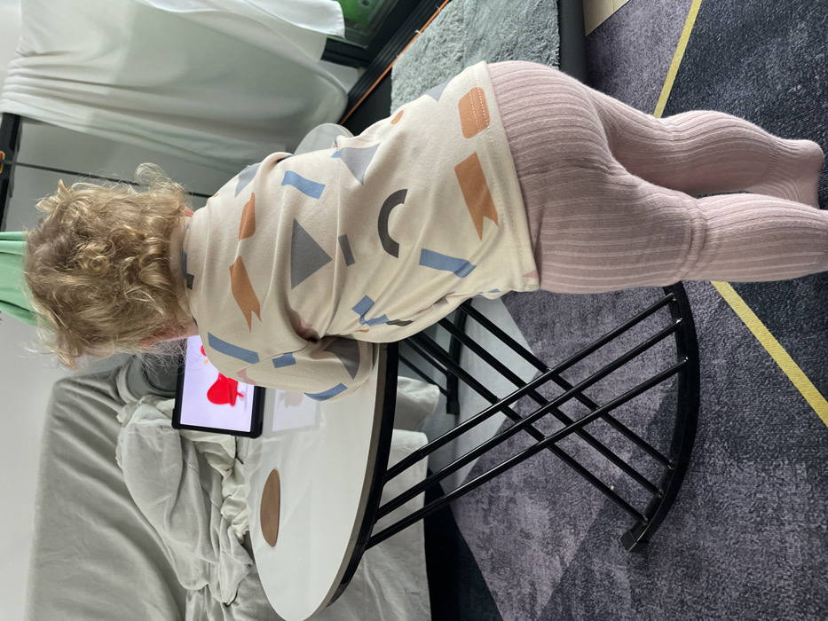 - "A toddler with curly blonde hair is leaning over a small, round white table with a black metal frame, looking at a tablet displaying a red image" by FM-oJoph1, licensed under CC BY 4.0