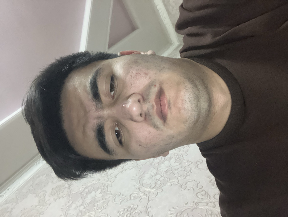 A person with dark hair and complexion, wearing a brown sweater, is featured in a downward-angled selfie. The face displays noticeable skin texture and pores. The background includes a white ceiling with molding and patterned wallpaper, possibly floral, suggesting an interior setting. The overall lighting is soft and diffused.