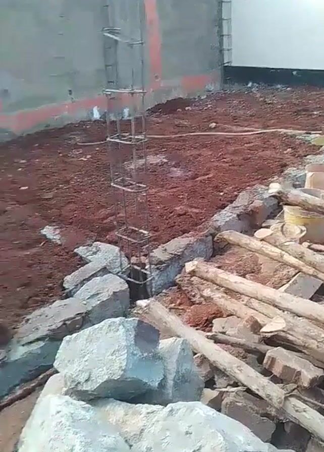 n active construction site. There's a man in a white hard hat, light-colored shirt and pants, and sandals leaning on a wheelbarrow with a shovel nearby, appearing to be resting. The ground is a mix of red soil, rocks, and broken bricks. A metal reinforcement structure stands upright. Scattered logs and a bucket are also visible. The background includes a white and gray concrete wall and a building with windows. A small dish with food and a spoon sit on the ground in the foreground.