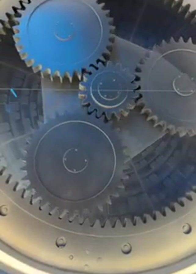 close-up of a complex gear mechanism with multiple interlocking gears. The gears are made of metal and are arranged in a circular pattern. The mechanism appears to be behind a glass or plastic panel, which creates a slightly distorted view. The gears are rotating, suggesting that the mechanism is in operation. The background is a mix of light and shadow, with some vague shapes visible through the panel. The focus is entirely on the gear mechanism itself.