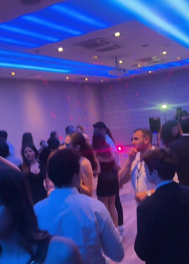 The scene is a well-lit indoor event, presumably a party or gathering, with many people present