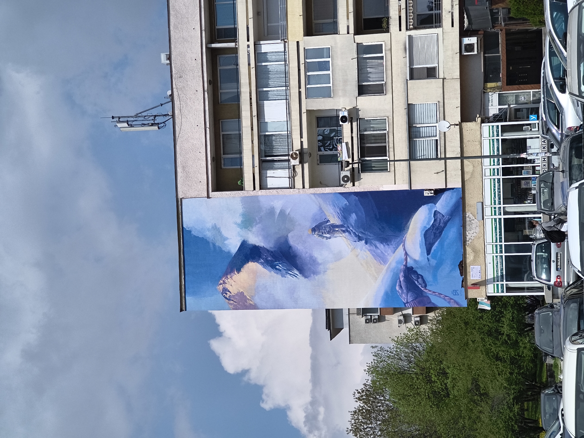 building in Sofia, Bulgaria, featuring a large mural on its facade. The mural depicts an abstract mountainous landscape with blue and white hues, possibly representing the nearby Vitosha mountain. The building has multiple windows, some with blinds or curtains. Air conditioning units are mounted on the exterior walls. Adjacent to the building is a shopfront with green and white framed windows. Several parked cars are visible in front of the building and a tree stands near the building. A clear sky with scattered clouds is above the building. Telecommunications equipment is visible on the roof of the building.