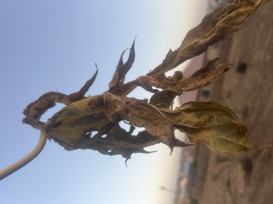 - "The image displays a close-up, upward-angled view of a cluster of severely withered and discolored plant leaves attached to a slender, light brown stem, set against a clear, light blue sky" by FM-Z7ZQT2, licensed under CC BY 4.0