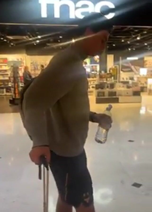 A young man standing in an airport holds a bottle of water and the handle of a rolling suitcase. He is wearing a gray sweater, black shorts, and white sneakers. Behind him is a brightly lit store with the sign "fnac" above it. The floor is shiny white tile. There are other people in the background.