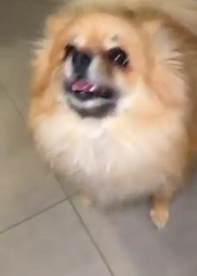 small, fluffy, golden-brown and white Pomeranian dog jumping up, seemingly toward the camera. The dog's tongue is visible. The video is shot at a low angle. The floor is tiled.