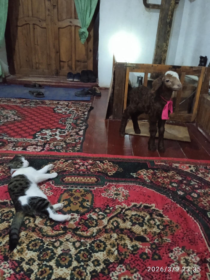 The scene depicts an interior room in Khujayli, Uzbekistan, at 23:35 on March 9, 2026. In the foreground, a domestic cat, predominantly white with dark tabby markings on its back and tail, lies supine on a large, ornate red carpet featuring cream, black, and brown patterns. To the right, a dark brown lamb with a distinct white patch on its forehead stands upright, positioned within or directly behind a light-colored wooden barrier or enclosure. The lamb wears a pink fabric tied around its neck and is oriented towards the left. In the background, a wooden double-leaf door is partially visible, with a draped green fabric hanging from above its frame. On a blue mat situated in front of the door, several pairs of dark-colored footwear, including shoes and sandals, are arranged. A bright, circular light source illuminates the upper right section of the wall. The floor consists of the red patterned carpet and exposed reddish-brown planks or floor borders.