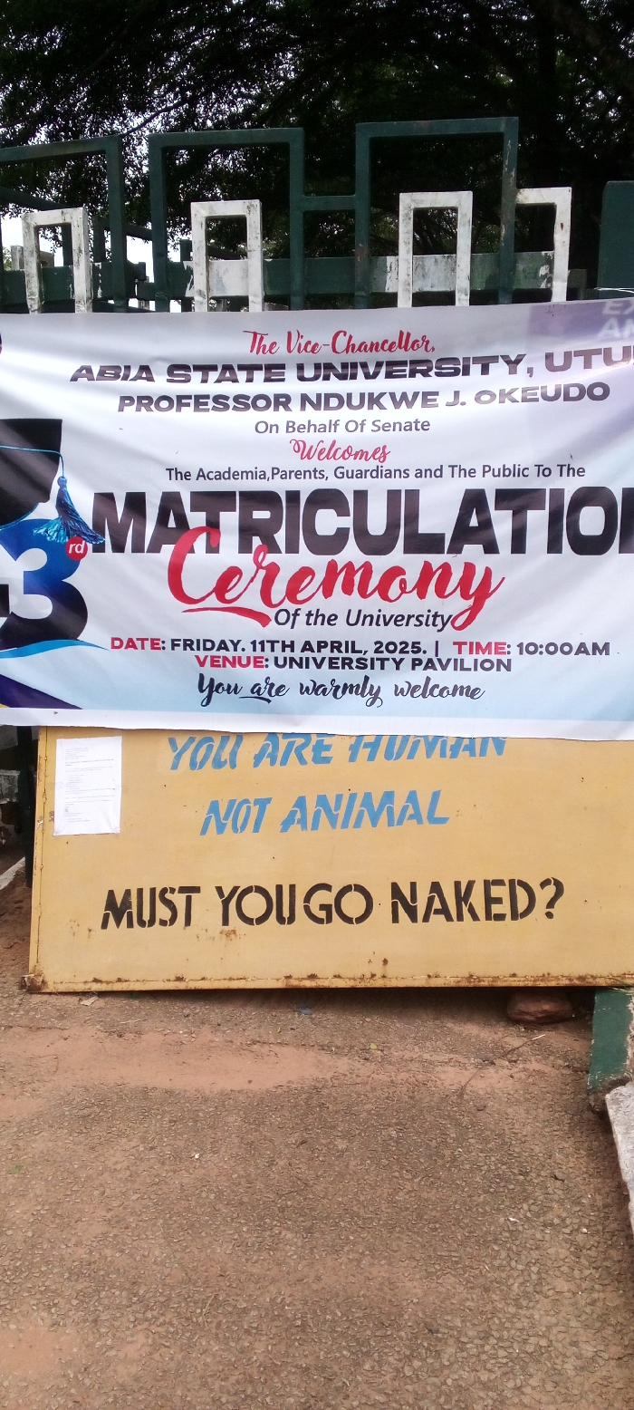 A sign advertises the Matriculation Ceremony of Abia State University, Uturu on Friday, April 11, 2025, at 10:00 AM in the University Pavilion. The Vice-Chancellor, Professor Ndukwe J. Okeudo, welcomes academia, parents, guardians, and the public on behalf of the Senate. Below the main sign is a yellow sign with the words: "YOU ARE HUMAN NOT ANIMAL MUST YOU GO NAKED?" in blue and black paint.