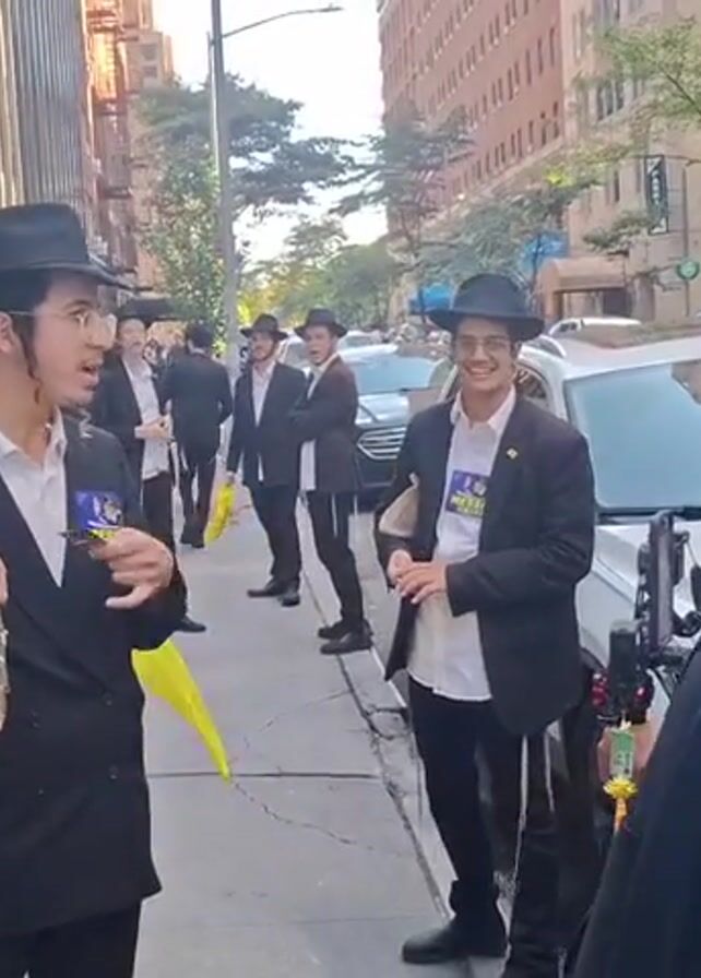 A group of boys, dressed in black suits, white shirts, and black hats are standing on a sidewalk. The boys are gathered in what appears to be a city setting, with cars and tall buildings visible in the background. One of the boys holds a wooden stick with yellow flags attached. The boys seem to be engaged in a conversation, gesturing as they speak. The boy holding the stick has a badge on his lapel, partially obscured. Other boys in the group also have similar badges. There are other individuals in the background, and some appear to be walking by.
