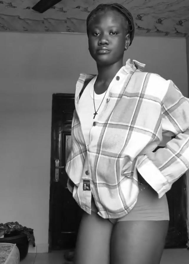 A young woman is standing in a room, posing for a photo. The photo is black and white. She is wearing a white t-shirt, shorts, and an unbuttoned plaid shirt. She has braids in her hair. There is a ceiling fan in the background. A door is also visible. She turns to the side to show her back and then turns to the front again.