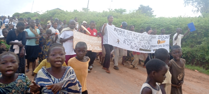 An outdoor scene in Kundu 1, Democratic Republic of the Congo, depicts a group of approximately 40-50 individuals, predominantly children and young adults, engaged in a procession or march on an unpaved dirt road. The ground is reddish-brown and uneven. In the background, a hillside covered with dense green vegetation, including trees and shrubs, rises under an overcast sky. The participants are dressed in varied casual attire, including t-shirts, dresses, and wraps of various colors and patterns. In the foreground, several children face the camera, some with open mouths, suggesting they are speaking or chanting. Two main banners are visible: 1. A large white banner, held horizontally by at least three individuals in the center-right, bears black text that reads: "AMANI NA KUPIGANISHA GRADER VITENDO VYA LJEHURI WAKATI WA VITA RDC SUD-KIVU TERRITOIRE DE FIZI FIZI LE". Below the word "GRADER," a stylized logo or emblem is present. 2. A smaller, light-colored banner, held by two individuals in the center-left, displays partial text, including "GROUPE D'ACTION POUR LE DEVELOPPEMENT" and "CPD-CONGO". Additionally, a young boy on the far right holds a blue folder or book aloft. Another individual near the smaller banner holds a light-colored wooden object. The group appears to be moving from left to right in the frame, participating in what appears to be a protest or demonstration related to peace and violence in the region.
