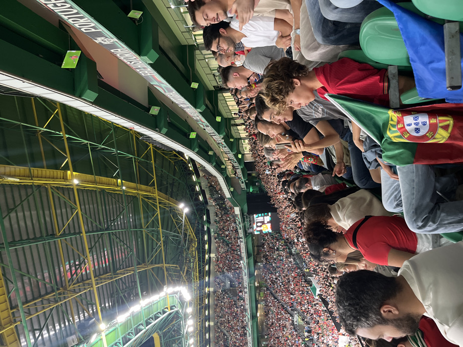 The image depicts a crowded indoor stadium, identified as Estádio José Alvalade in Lisbon, Portugal, due to its distinctive green and yellow structural elements and the visible "FAZ HISTÓRIA PORTUGAL" signage