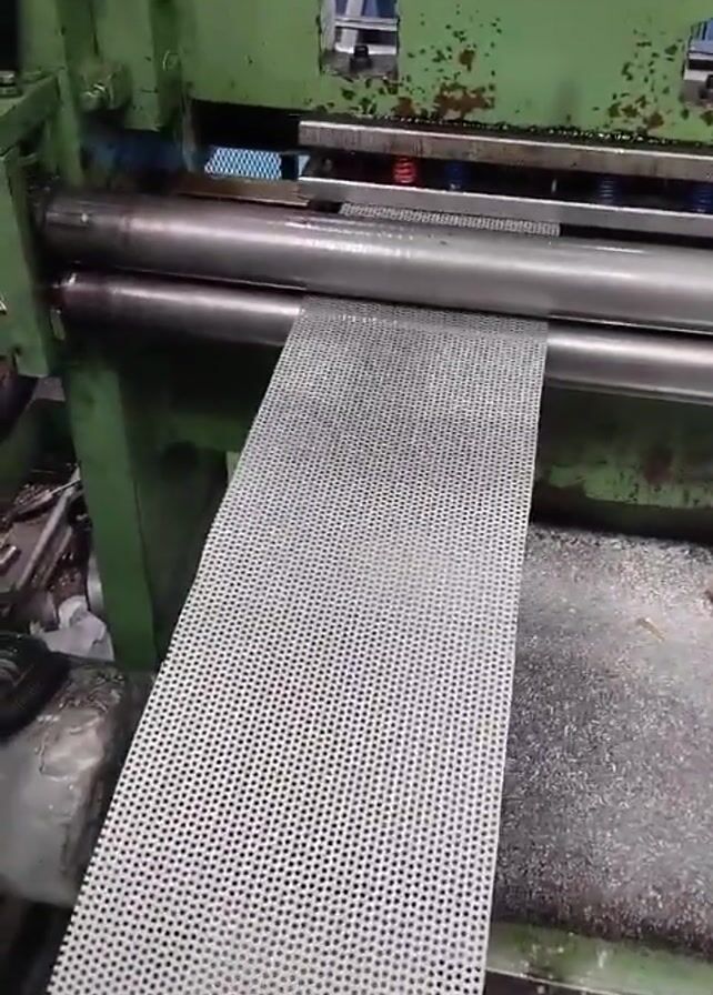 piece of metal mesh being fed through a large, green industrial machine. The mesh is flat and has a grid pattern of small holes. The machine has two cylindrical rollers through which the mesh passes, and a large, red-trimmed flywheel on the left side indicates that it is powered mechanically. The machine appears to be stamping or shaping the mesh as it moves through. The environment seems to be a factory or workshop.