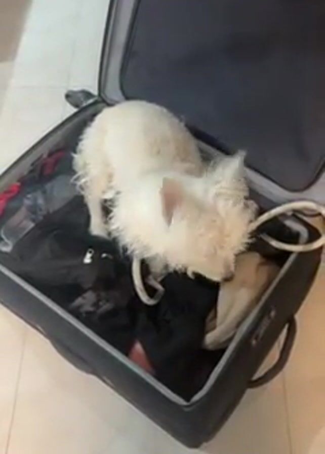 A small, white, shaggy dog is sitting inside an open black suitcase filled with clothing. The dog is looking around. The suitcase is on a light-colored floor.