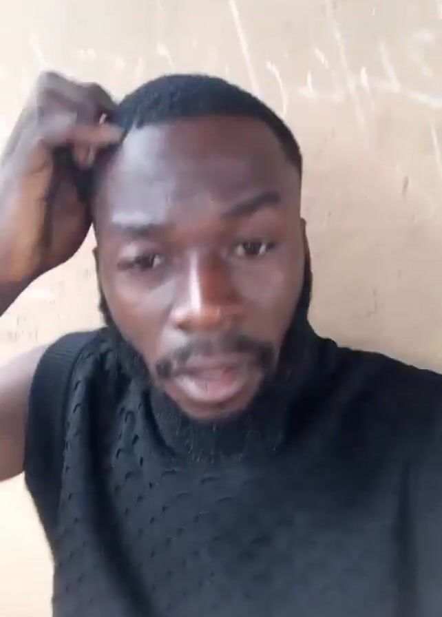 The video features a Black male with a dark beard, wearing a black textured sleeveless shirt, standing in front of a light-colored wall with writing on it. He rubs the top of his head with his hand and speaks.