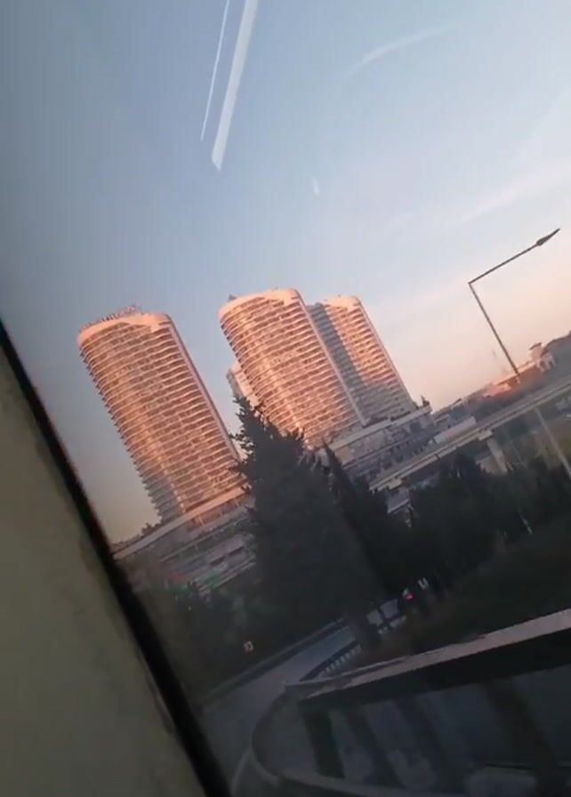 view from inside a vehicle, looking out through a window as it travels along a road. In the distance, there are several tall, cylindrical buildings reflecting the light of the setting sun. Closer to the road, there is a line of trees along the roadside. The road itself is a winding curve. The window is somewhat reflective, showing indistinct shapes of the interior of the vehicle.