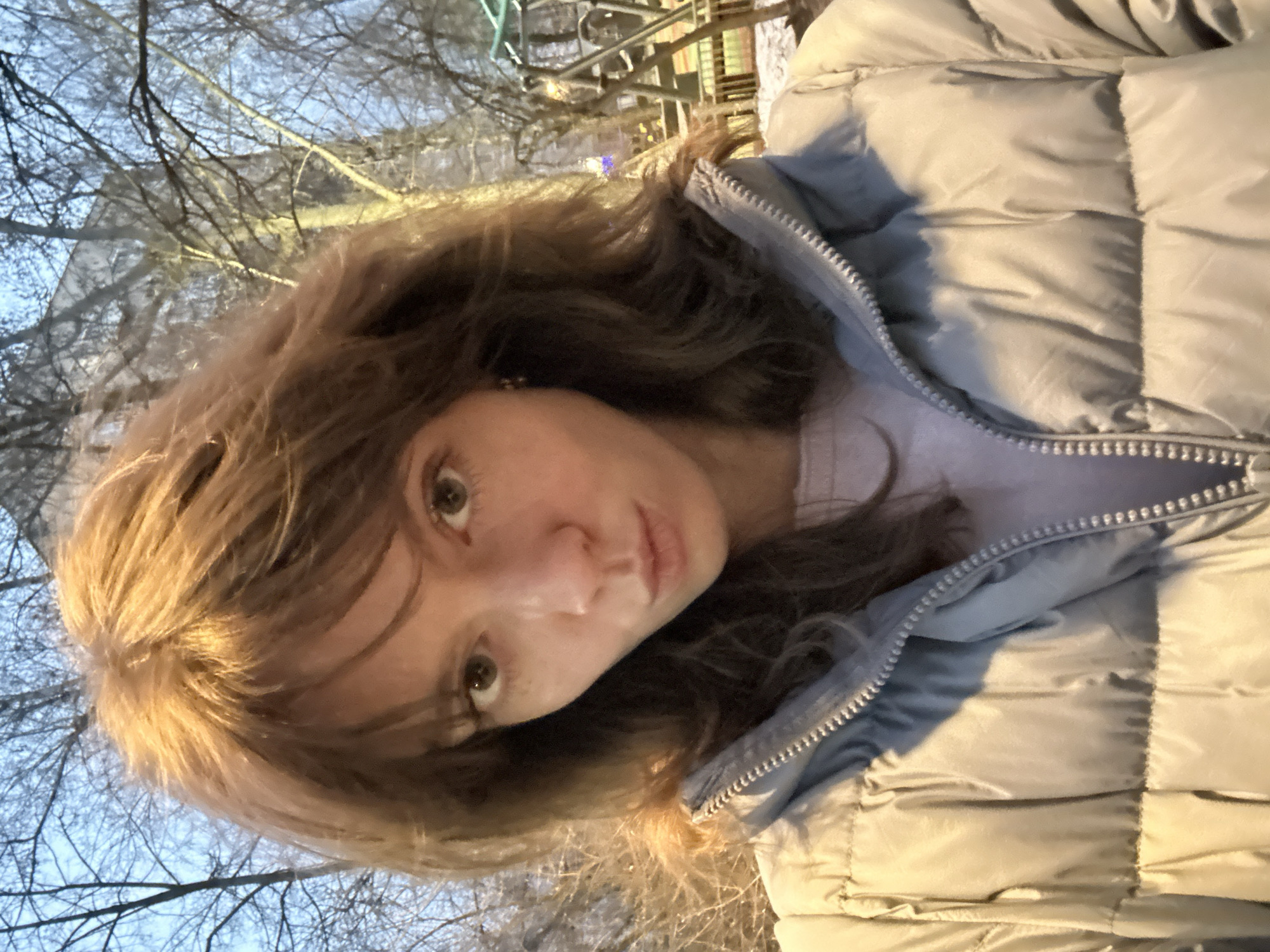 A young woman with brown hair and light eyes looks at the camera. She is wearing a light-colored puffer jacket, zipped partway up. The background shows bare trees against a dim sky, and indistinct structures which appear to be an outdoor playground. The location is likely Moscow, Russia due to the architectural style of the playground equipment, as well as winter-like weather common for this location.