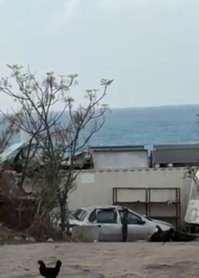 The scene features a rooster strutting on a dirt ground, with a view of the ocean in the background. A white car without tires, and several white shipping containers are also visible. A bare tree is to the left of the rooster.