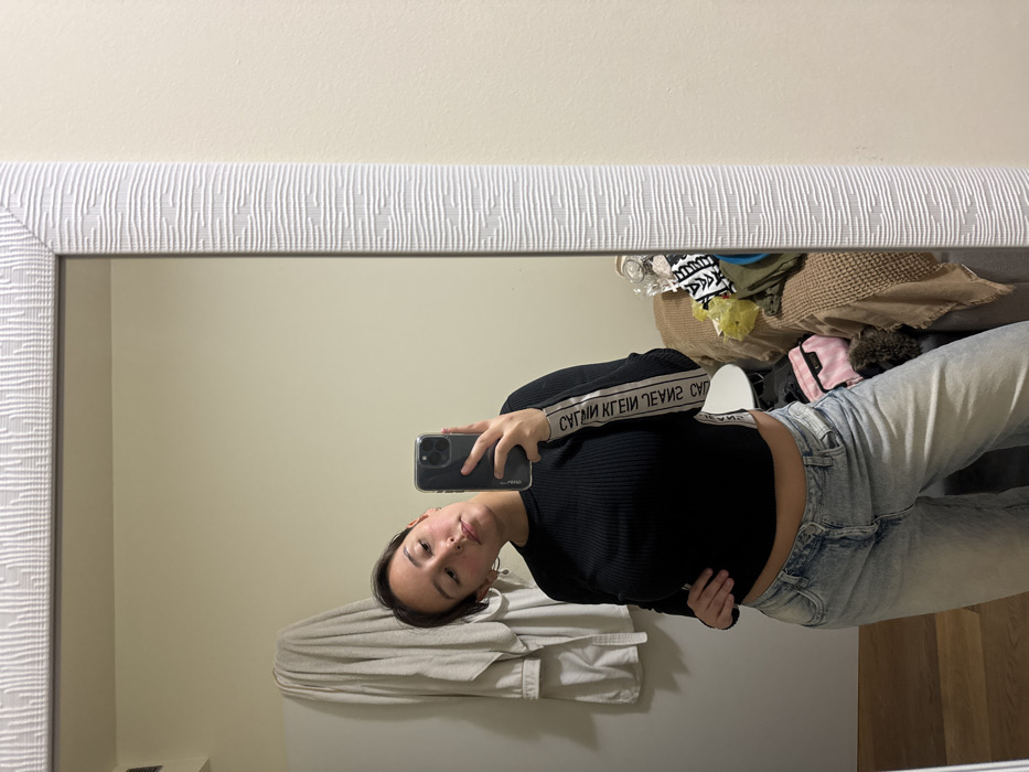 A young female subject is depicted in a mirror selfie taken within an indoor residence in Ramat HaSharon, Israel. She is wearing a black ribbed long-sleeve crop top featuring 'CALVIN KLEIN JEANS' branding on the outer sleeves and light-wash, wide-leg jeans. The subject holds a dark-colored smartphone, enclosed in a clear case, in her left hand (viewer's right), angled to capture her reflection in a large, rectangular mirror with a textured white frame. Her head is tilted slightly to her right, and her right hand rests on her hip. The reflected background reveals light-colored walls, with a grey bathrobe hanging on a hook to the left of the subject. To her right, a cluttered area includes a small circular table, a brown textured throw draped over furniture, a pink bag, a dark furry object, a green fabric item, and various indistinct personal objects. A light brown wooden floor is visible at the bottom left of the reflection.