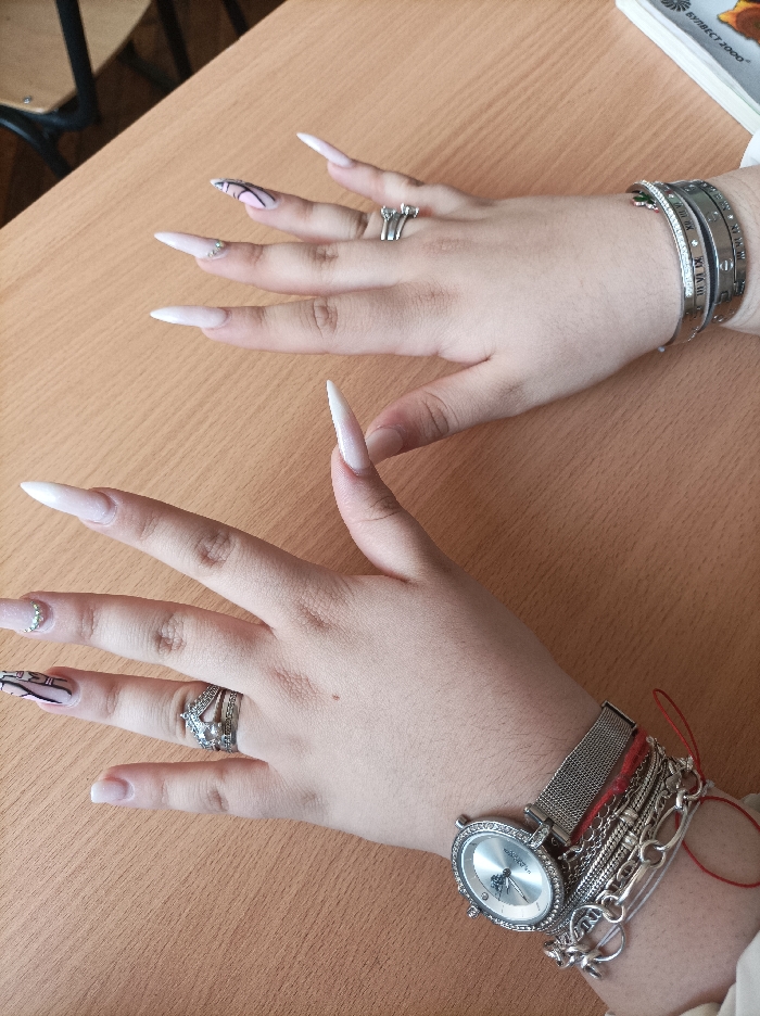 The image displays two human hands resting on a light brown, wood-grained tabletop in Cherven Bryag, Bulgaria. Both hands exhibit elongated, pointed fingernails with a light pink-to-white ombré design. The ring and middle fingers of each hand feature additional embellishments: the ring fingers have black line art with pink accents, and the middle fingers display small clear rhinestones near the cuticles. The left hand, positioned closer to the viewer, wears a silver-toned multi-band ring with a crown-like design on the ring finger. Its wrist is adorned with a silver-toned mesh band wristwatch featuring a clear-stoned bezel, several silver-toned chain bracelets, and a red string bracelet. The right hand, positioned further from the viewer, wears a silver-toned three-band ring on the ring finger. Its wrist is accessorized with three silver-toned bangles, one featuring engraved Roman numerals and another with embedded clear stones. In the upper right background, a white book or folder with the partially visible text "БУЛВЕСТ 2000" and a green logo is present. An indistinct dark object is visible in the upper left background. The overall setting appears to be indoors, likely an educational or office environment.