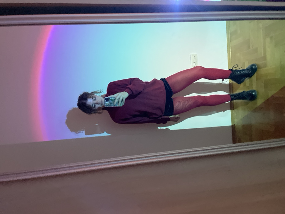 A woman is visible in a mirror selfie. She is wearing a maroon sweatshirt, a black mini skirt, red tights with paisley patterns, and black combat boots. She is holding a cell phone in her left hand. The background is a wall that has a rainbow light projection on it. To the right, the floor is visible, and there is an electrical outlet on the wall.