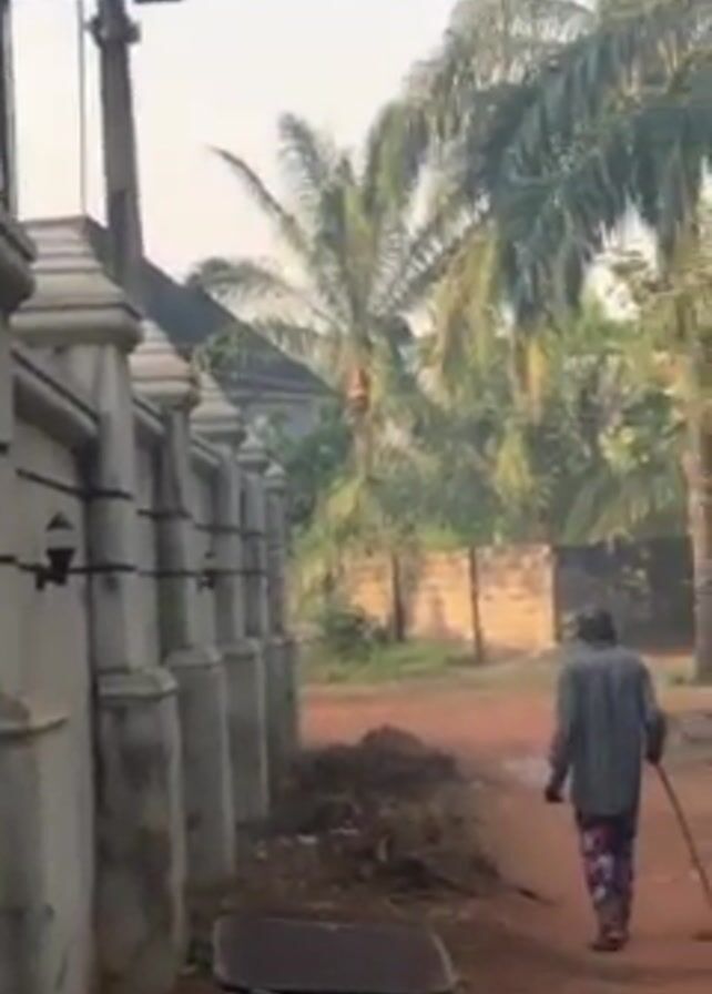 man sweeping a pile of debris with a rake on a dirt road, next to a tall fence. The fence is light gray and has evenly spaced pillars with decorative tops and lights mounted between them. Beyond the fence, there are several palm trees and another building is visible. A wheelbarrow is parked near the pile of debris. The man is wearing a gray shirt and colorful pants. In the distance, another person appears to be in a palm tree. The weather is bright and the sky is overcast.