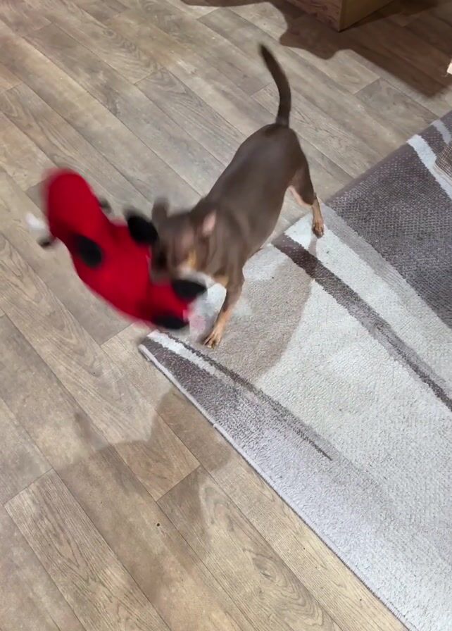 A short-haired, brown chihuahua is playing with a red toy. The toy appears to be a reindeer, with black hooves and white antlers. The dog grabs the toy in its mouth and shakes it around. A human hand reaches towards the dog. The scene takes place on a wooden floor, with a rug visible in the background.