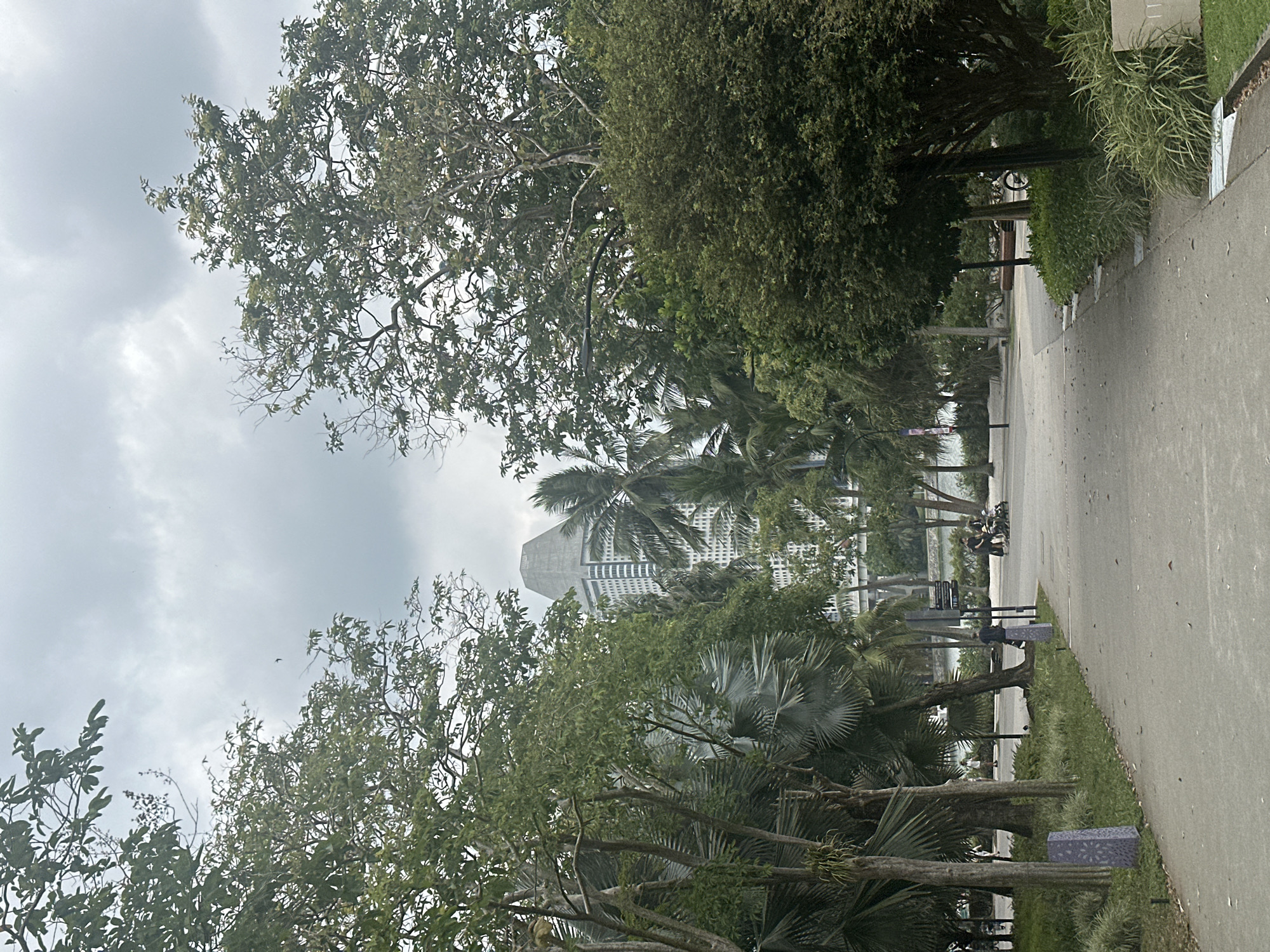 The image depicts a paved pathway in an urban park environment in Singapore's Marina Bay area, with the OUE Bayfront building visible in the background. The pathway, light grey in color and slightly curved, extends into the mid-distance, flanked by manicured grass verges and various shrubs. Numerous trees, including broadleaf and palm species, frame the scene on both sides, with dense green foliage partially obscuring the distant skyline. Some tree branches are bare against an overcast, grey sky. A body of water is faintly visible beyond the trees in the mid-ground. Several individuals are present on and near the pathway. In the mid-ground, a person wearing a dark top is positioned on a dark scooter or bicycle on the left side of the path. Further along the path, two individuals are standing near a three-wheeled utility vehicle; one wears a light-colored top, the other a dark top. Beyond them, a person pushes a baby stroller alongside another individual, and a separate person in a light top is visible further to the left. Architectural features include a prominent modern skyscraper with a distinctive angular, sloped grey roof (OUE Bayfront building) rising above the tree line in the center-right background. A patterned grey bollard or light fixture stands on the left side of the pathway in the foreground, and a dark street lamp or utility pole is visible on the right side. The overall scene suggests a public recreational area under an overcast sky.