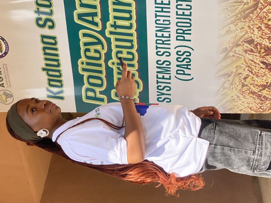 The image depicts a young adult female standing in an outdoor setting in Unguwar Rimi, Nigeria, possibly against a building wall. She has long, reddish-brown braided hair partially covered by a dark olive green headband, and wears a large white, flower-shaped earring on her visible right ear. She is dressed in a white short-sleeved polo shirt with an "AGRA" logo on the left chest, and dark grey cargo pants. On her right wrist, she wears a multi-colored beaded bracelet. Her right hand is raised, holding a dark cylindrical object (possibly a pen) and pointing it towards a large vertical banner positioned to her right. The banner features a green background section with white text, partially visible, reading "Kaduna State Policy And Agriculture" and further down, "SYSTEMS STRENGTHENING (PASS) PROJECT". The lower section of the banner displays an illustration of golden rice or wheat crops. A plain light brown wall is visible behind and to the left of the individual.