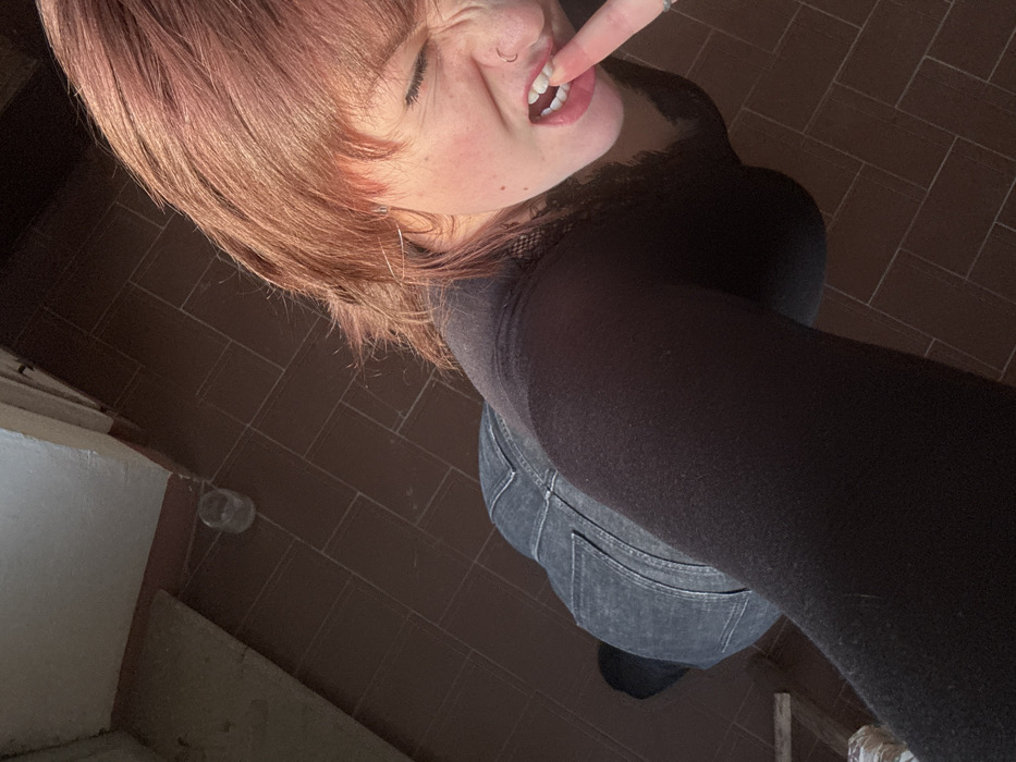 - "A woman with reddish-brown hair is positioned at an unusual angle, possibly a selfie" by FM-IdNfF2, licensed under CC BY 4.0