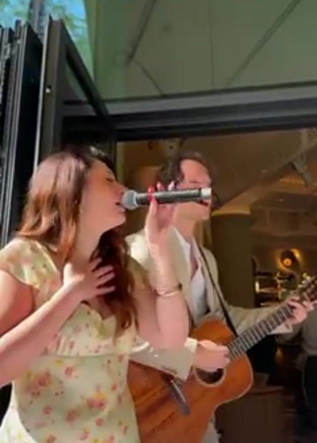 A woman in a floral dress sings into a microphone while a man plays an acoustic guitar. They stand in front of an open doorway leading into a restaurant. A server wearing a bow tie walks past in the background. The woman holds her hand to her chest as she sings. The man wears a suit jacket. The video appears to be taken outdoors in daylight.