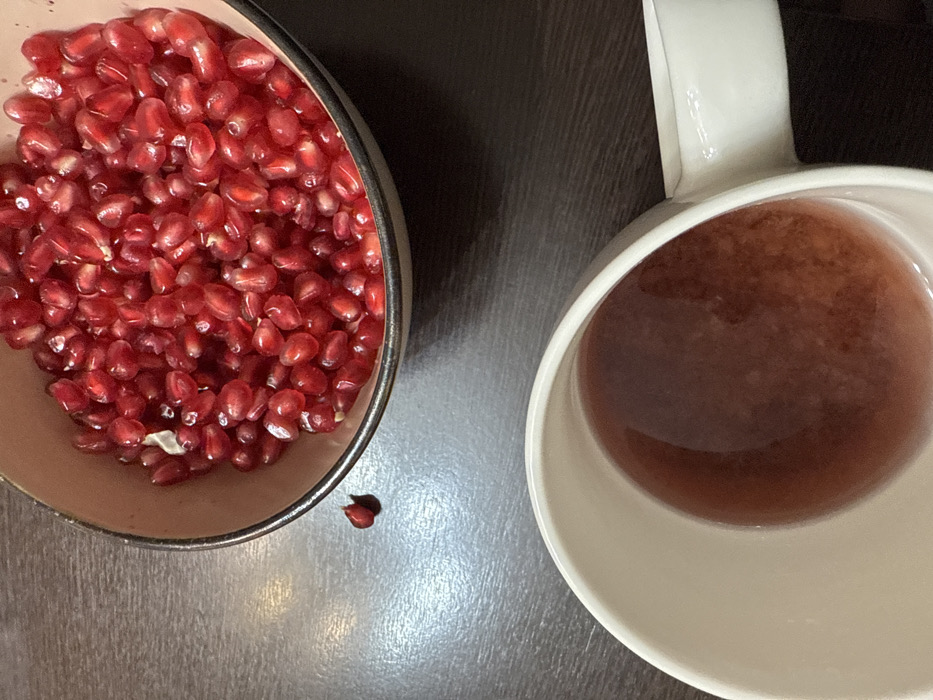 The image displays an overhead perspective of a dark brown wood-grain surface, likely a table. In the upper portion, a light-colored ceramic bowl with a dark rim is filled to the brim with numerous bright red pomegranate seeds. A single, detached pomegranate seed rests on the surface to the left of the bowl. In the lower portion of the frame, a white ceramic mug, positioned with its handle visible on the right side, contains a reddish-brown liquid, which appears to have visible sediment or particulate matter. No individuals are present in the scene, and no actions or interactions are depicted. The environment is an indoor setting; however, the image provides no discernible visual information or identifying markers to specify its location within the city of Yerevan, Armenia, or any other geographical area.