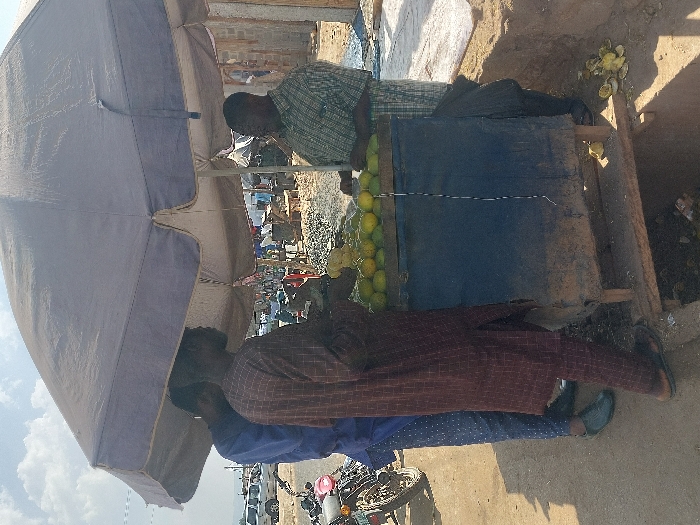 This image captures an outdoor street vending scene in Akwanga, Nigeria, under a bright sky
