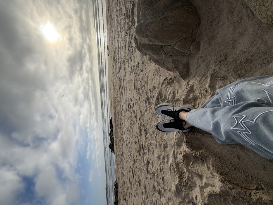 The image depicts a first-person perspective view from a sandy beach in Matosinhos, Portugal, looking towards the Atlantic Ocean under a partly cloudy sky. In the immediate foreground, a person's lower legs and feet are visible, extended onto the light-brown sand. The individual wears light-blue denim pants featuring white embroidered geometric patterns, and black and white athletic shoes with dark laces. To the right, a large, light-brown, irregular rock formation is embedded in the sand. The midground consists of an expansive sandy beach with multiple dark rock formations scattered near the waterline on the left. The ocean displays parallel lines of breaking waves. The background features a horizon where the ocean meets a sky with a mixture of blue patches and extensive white and grey clouds. A bright sunburst is prominent in the upper right, casting glare on the water. A small, dark bird is visible in flight in the upper-left sky. A distant structure, possibly a crane or industrial element, is faintly discernible on the far right horizon.