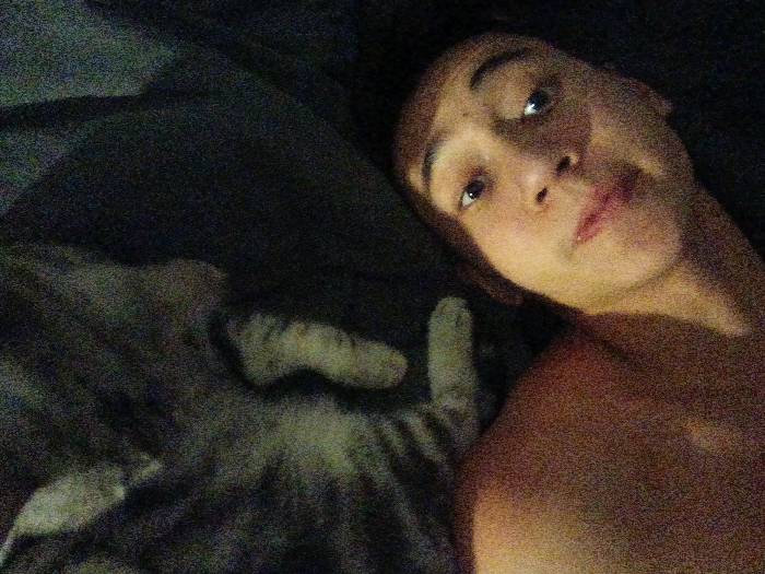 A person lies on a dark surface, presumably a bed. Their head is tilted, and they look upwards at the camera with a relaxed expression. To their left, partially obscured, is a cat lying down, its tail and paws visible. The lighting is dim, and the overall image has a grainy texture. The person's shoulder is visible in the lower right corner, bare.