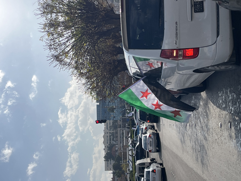 An overhead-angle image captures a daytime street scene in Al-Muhajerin Municipality, Syria, depicting stationary or slow-moving traffic on a multi-lane asphalt road. In the immediate foreground on the right, the rear section of a white Hyundai Starex van is visible, with its rear right brake light illuminated red. A flag, featuring horizontal stripes of green (top), white (middle), and black (bottom) with three central red five-pointed stars on the white stripe, is prominently displayed, extending from the rear passenger window of the van. A reflection of a similar flag is visible on the van's side window. Further down the road, numerous other vehicles, including sedans, vans, and SUVs, are observed in traffic, extending into the midground. Another identical flag is discernible on a vehicle further down the road on the left. The road surface features small, white, raised circular markers. In the background, a red traffic light is suspended above the road. Beyond the road, several multi-story buildings are visible, including a lighter-colored structure on a hillside to the left and a prominent building with a blue glass facade in the center. A line of deciduous trees with bare branches borders the right side of the road behind the van. The sky above is bright blue with scattered white cumulus clouds, indicating fair weather. No individuals are explicitly visible in the frame, though occupants are implied within the vehicles. The scene is brightly illuminated by natural sunlight, casting shadows to the left.